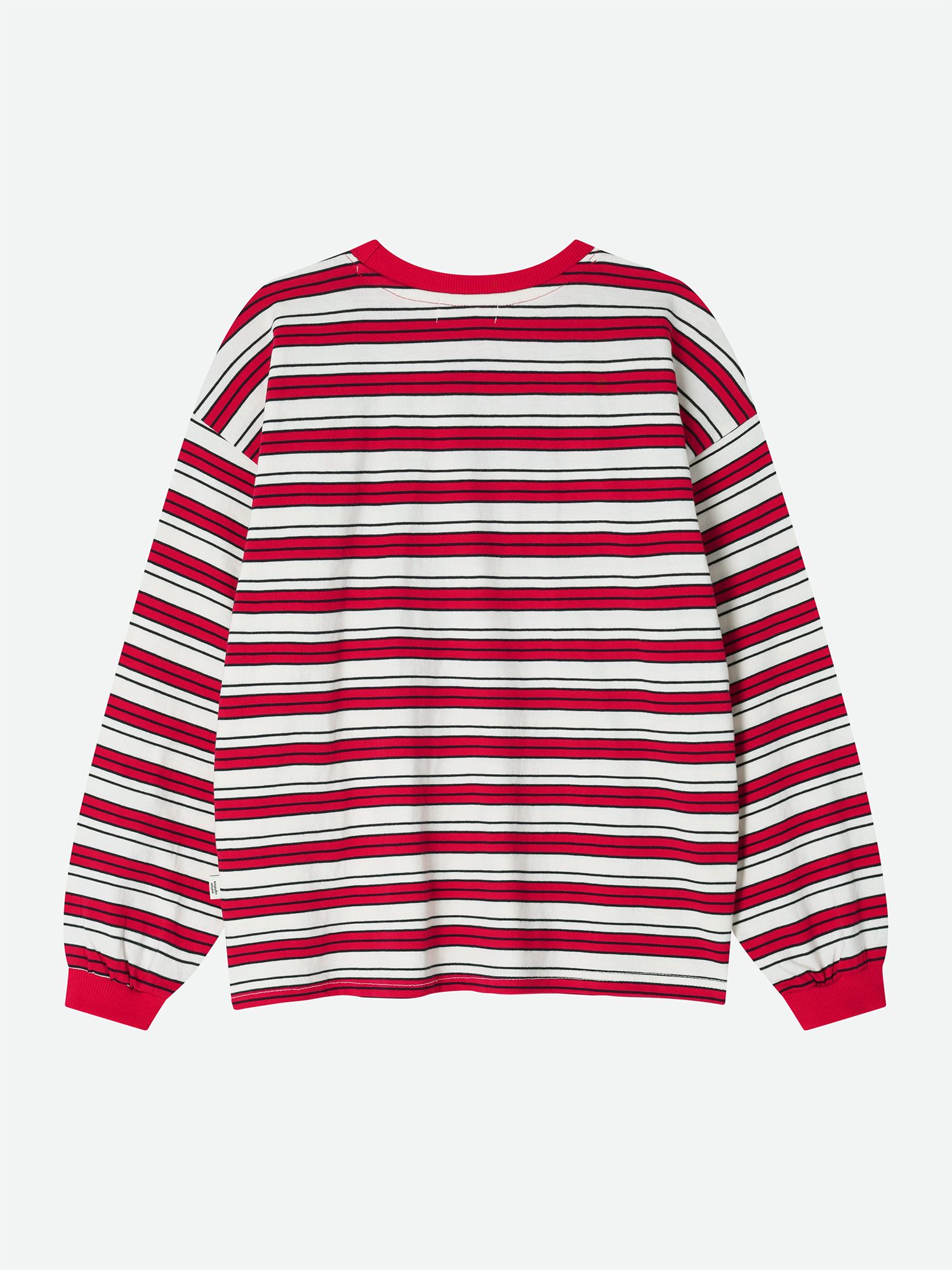 클래식한 스트라이프 패턴으로 완성한 티셔츠입니다. 넥과 소매 립에 컬러 포인트를 더해 깔끔한 인상을 주며, 로고 자수 디테일로 브랜드 무드를 자연스럽게 담았습니다. 부드럽고 탄탄한 코튼 소재를 사용해 편안하게 착용할 수 있고, 그린과 레드 두 컬러로 구성되었습니다. 아우터 안 이너로도 활용하기 좋아 사계절 내내 입기 좋습니다.